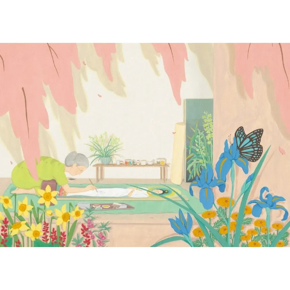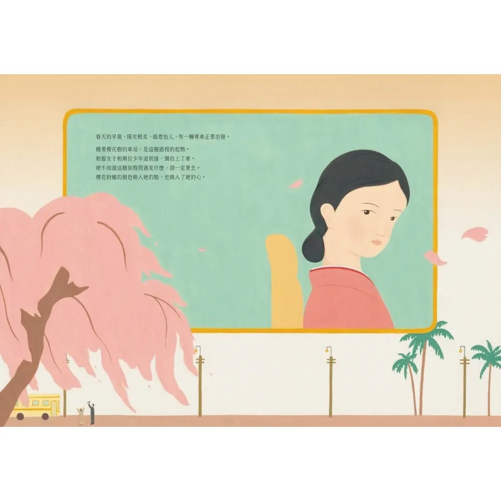 櫻花盛開的春晨,一輛車緩緩駛向山頂的畫室……沿途的山川與花木象徵時光的流轉,而車廂內的女子們談笑、回憶,在重重花影間訴說著與陳進相遇、學畫、成長的點滴。全書勾勒出畫家對藝術的堅持、筆下人物對創作者的深情,以及女性在時代浪潮中永不退縮的勇氣與光彩。