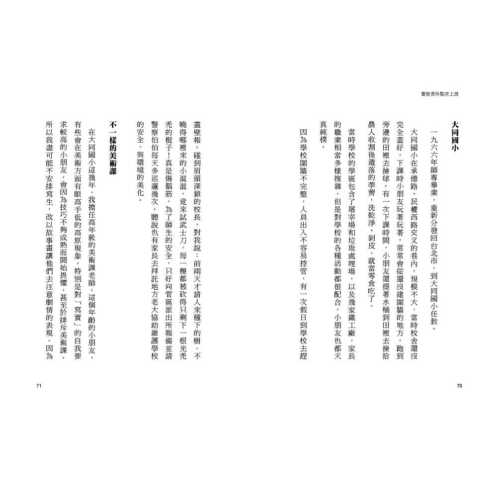 曹老師在一九七一年毅然決然離開穩定的國小教職,加入當時台灣省教育廳所屬的兒童讀物編輯小組,展開了他往後「童書編輯」與「創作者」同步共舞的生涯。對於台灣兒童文學史略有所聞的讀者可能就會知道,當時教育廳的兒童讀物編輯小組,對於台灣童書的出版與發展,具有關鍵性的歷史貢獻。──台東大學兒童文學研究所副教授 游珮芸