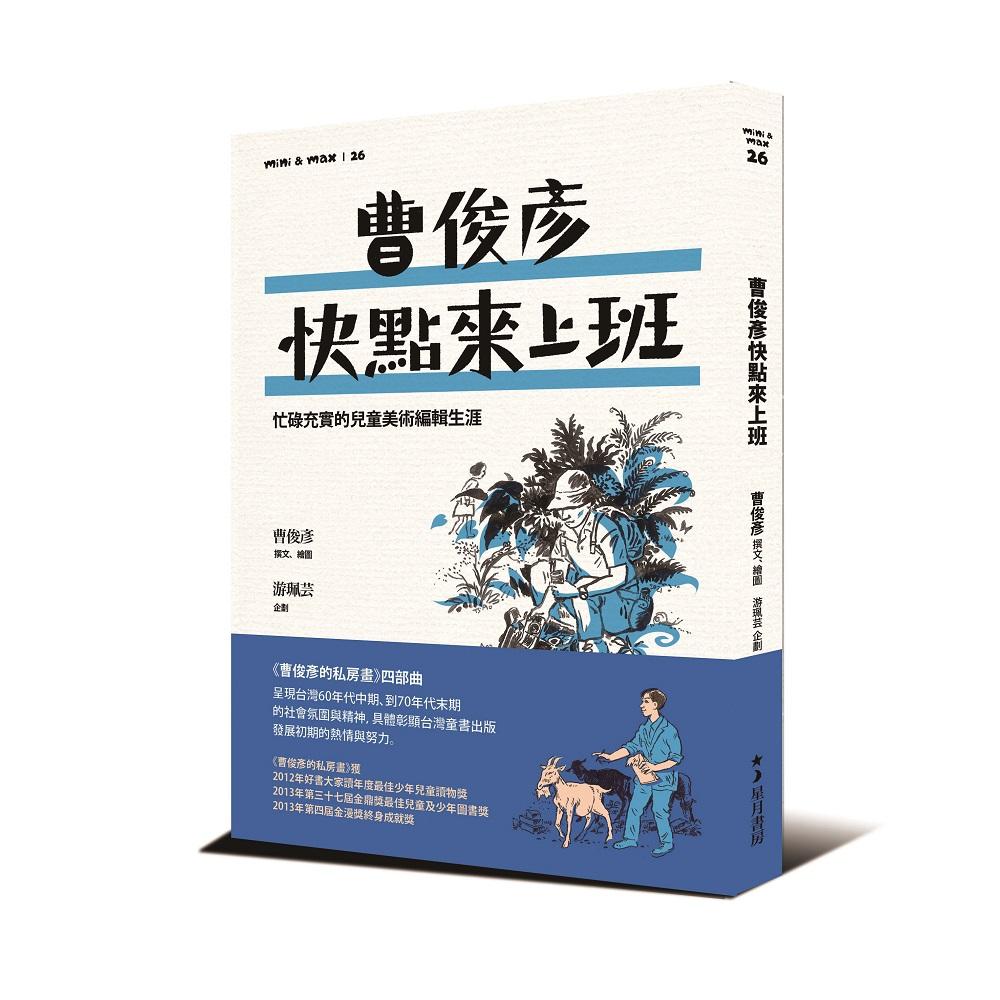 以潘人木總編在電話裡對我說的「曹俊彥!快點來上班」這句話當書名,是因為這本書說的故事涵蓋一九六四年到一九八○年這段時間,是我擔任中華兒童叢書美術編輯之前的六年多、和當編輯的九年多,當中關鍵的一個時間點。而在這個時間點前後敘述的大都是我與兒童讀物編輯小組有關的事情,採用關鍵的這一通電話作為書名,是合理而有趣的。